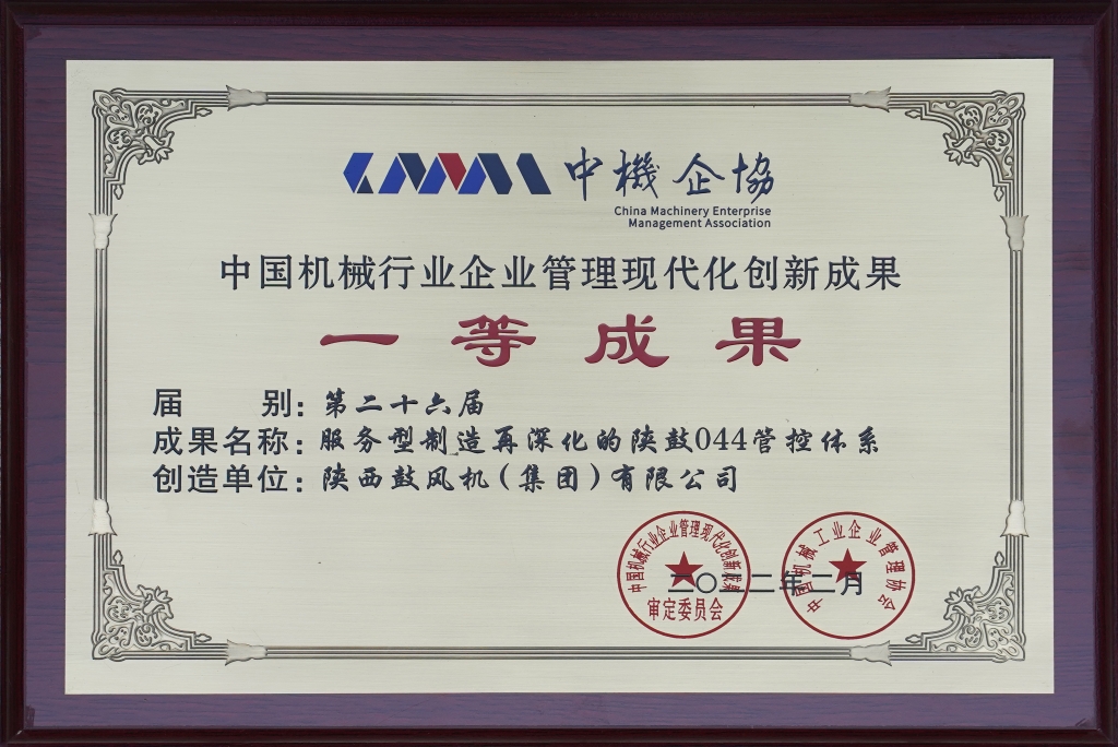 • 2022-“服務(wù)型制造再深化的陜鼓 044 管控體系”?榮獲第二十六屆中國(guó)機(jī)械行業(yè)企業(yè)管理現(xiàn)代化創(chuàng)新成果一等獎(jiǎng)
